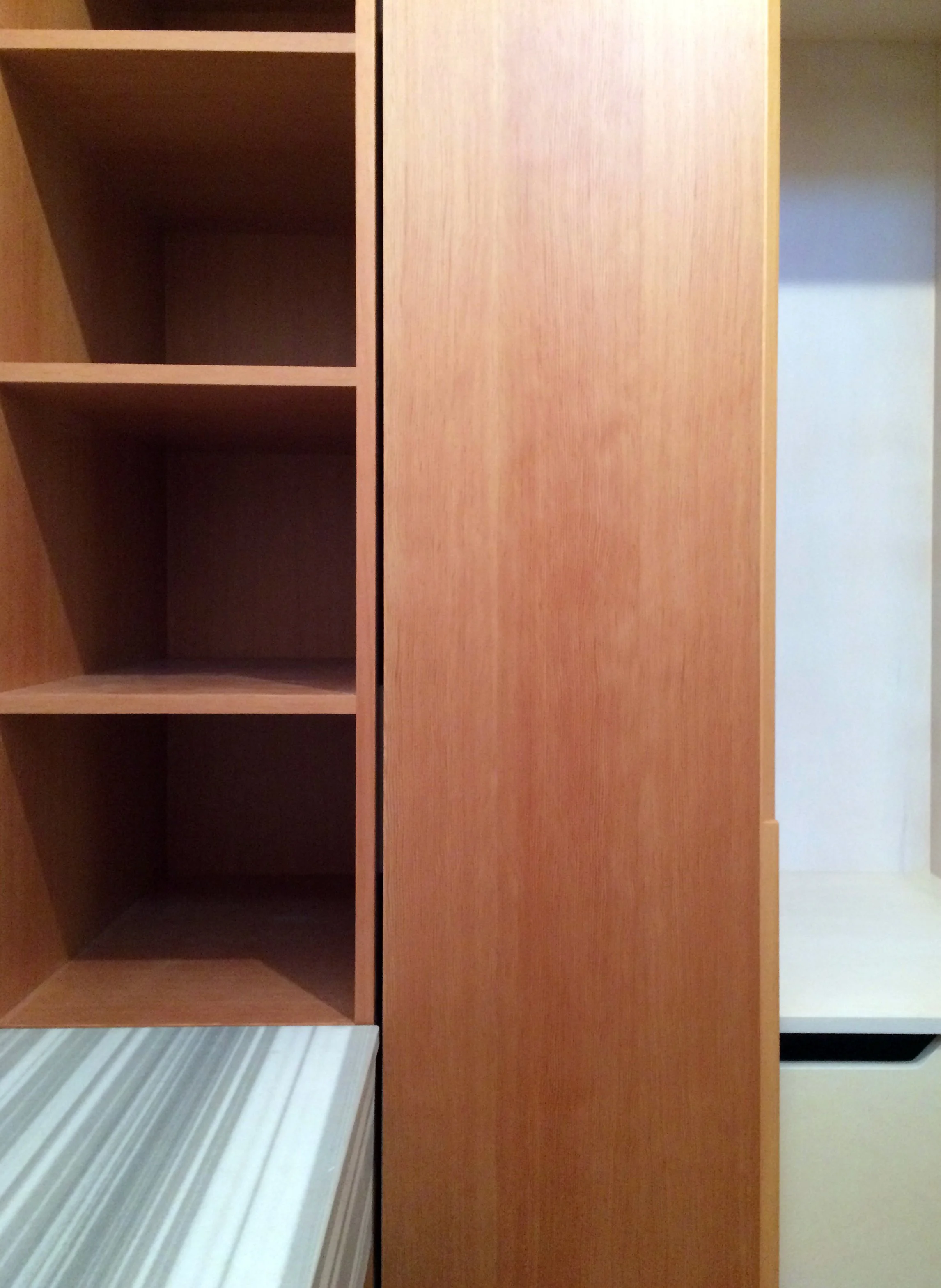 A reconfiguration of a cloakroom to incorporate surfaces, shelving and additional storage.