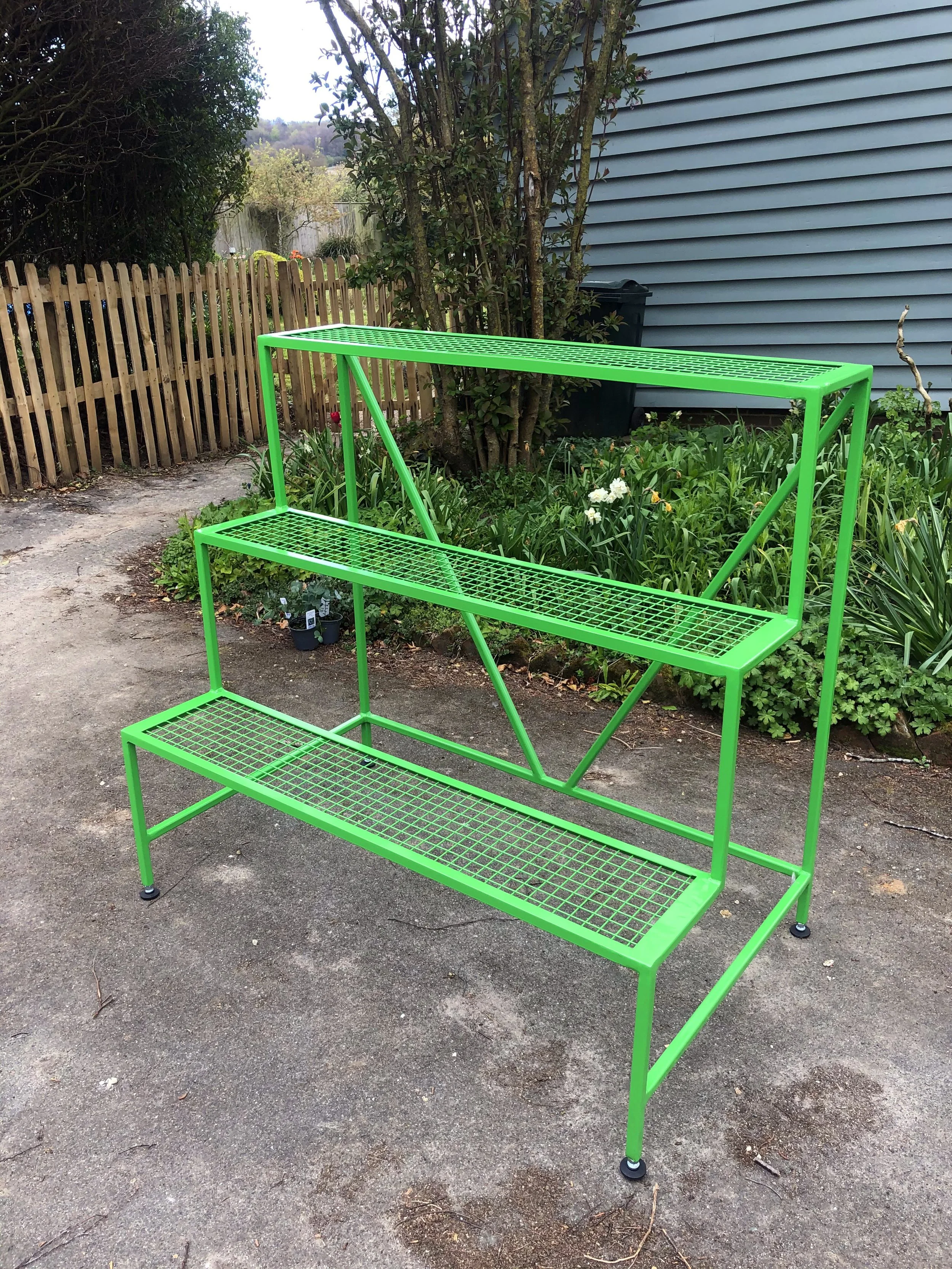 PLANT STAND Bespoke stepped display stand for potted garden plants. Steel construction in painted RAL 6037 Pure Green. Slide 1 Slide 1 (current slide) Slide 2 Slide 2 (current slide) Slide 3 Slide 3 (current slide)
